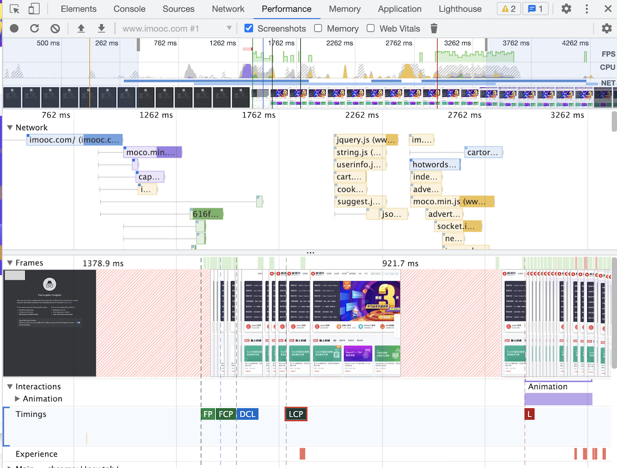 Performance 可以检测到上述的性能指标,并且有网页快照截图。