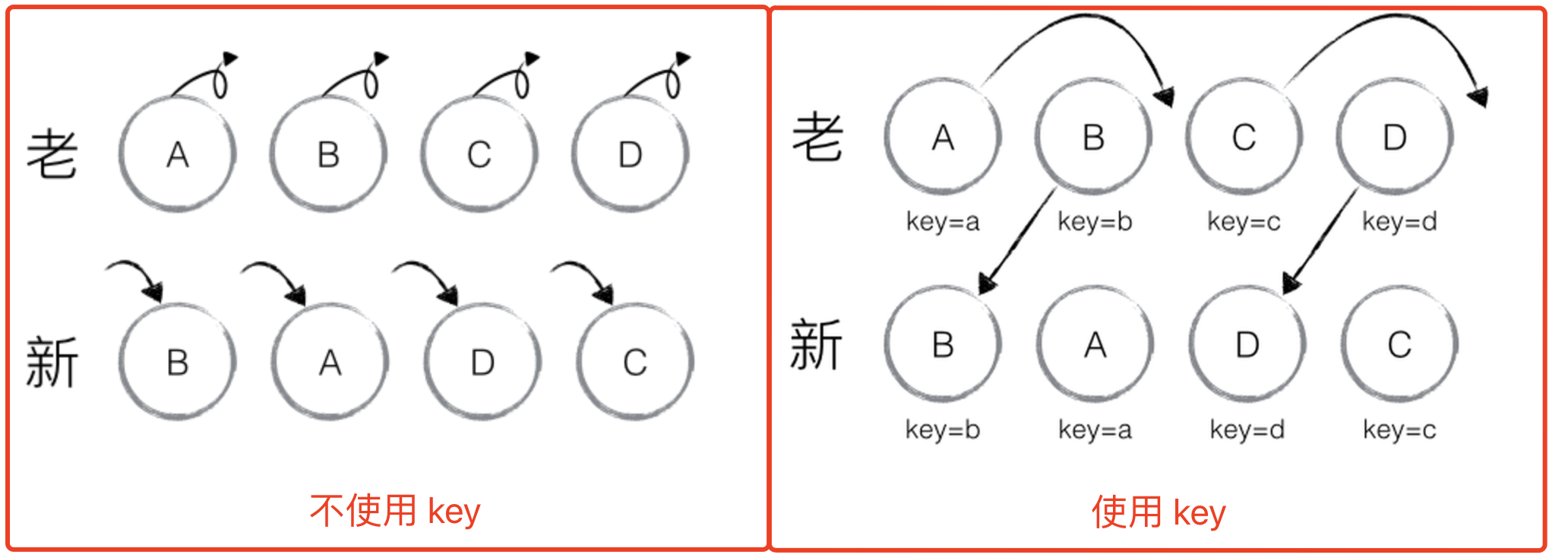无论在 Vue 还是 React 中,key 的作用都非常大。以 React 为例,是否使用 key 对内部 DOM 变化影响非常大。