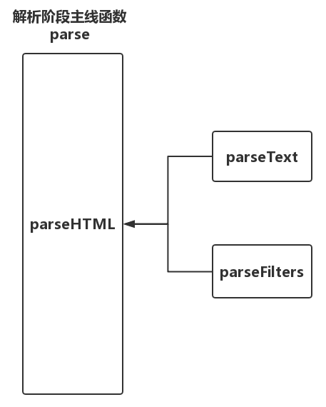 从上面代码中可以看到,parse 函数就是解析器的主函数,在parse 函数内调用了parseHTML 函数对模板字符串进行解析,在parseHTML 函数解析模板字符串的过程中,如果遇到文本信息,就会调用文本解析器parseText函数进行文本解析;如果遇到文本中包含过滤器,就会调用过滤器解析器parseFilters函数进行解析。