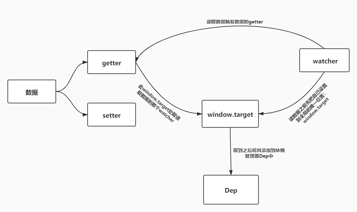 简单总结一下就是:Watcher先把自己设置到全局唯一的指定位置(window.target),然后读取数据。因为读取了数据,所以会触发这个数据的getter。接着,在getter中就会从全局唯一的那个位置读取当前正在读取数据的Watcher,并把这个watcher收集到Dep中去。收集好之后,当数据发生变化时,会向Dep中的每个Watcher发送通知。通过这样的方式,Watcher可以主动去订阅任意一个数据的变化。为了便于理解,我们画出了其关系流程图,如下图: