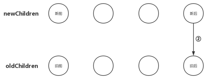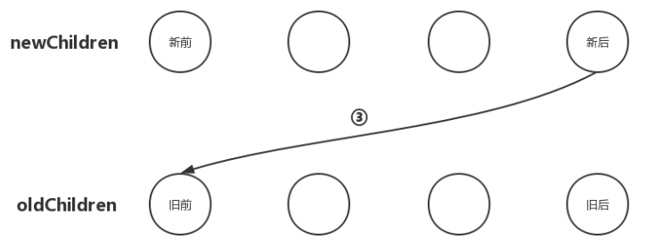 同样,这种情况的节点移动位置逻辑与“新后与旧前”的逻辑类似,那就是newChildren数组里的第一个子节点与oldChildren数组里的最后一个子节点相同,那么我们就应该在oldChildren数组里把最后一个子节点移动到第一个子节点的位置,如下图: